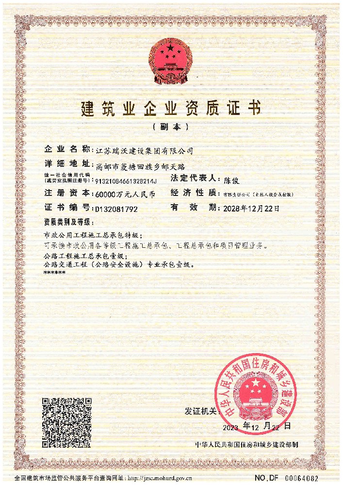 江蘇瑞沃建設集團有限公司成立于2007年,是一家以市政、交通工程建設為主導,集房屋建筑、交通安全設施、城市道路照明工程、電力工程、隧道工程、航道工程及投融資為一體的綜合性企業。企業注冊資本60000萬元,現有各類技術人員580人,其中中、高級以上人員498人,注冊類人員268人,一、二級建造師166人。公司榮獲“江蘇省建筑業優秀企業”、“江蘇省五一勞動獎狀”,連續多年被評為“揚州市先進企業”、“江蘇省建筑業百強企業”,連續八年蟬聯百強企業基礎設施類第一名。